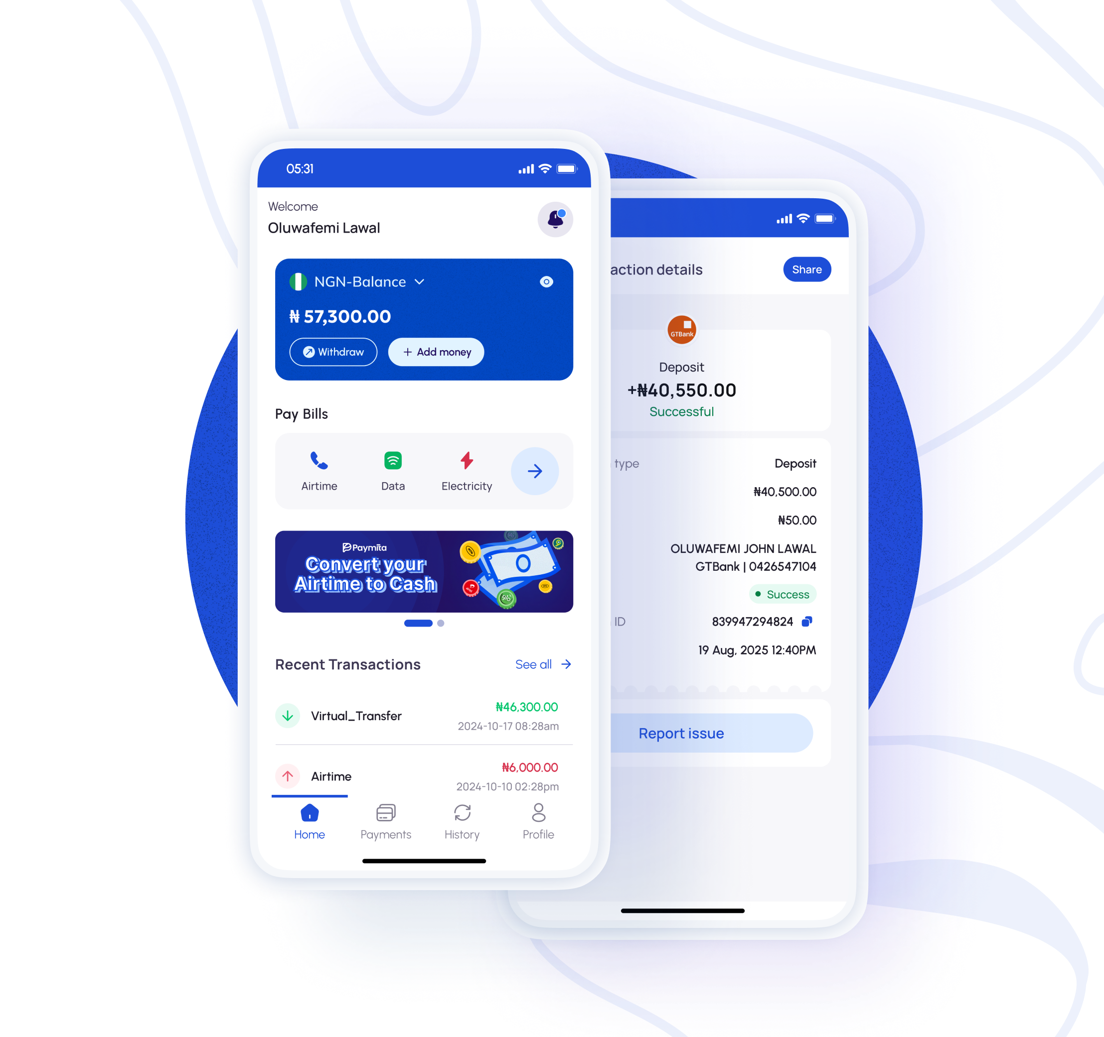 Instant airtime and data delivery, Convert your airtime to cash, Virtual dollar card and NGN card provider, Make bill payments with Paymita. The all-in-one payments app.