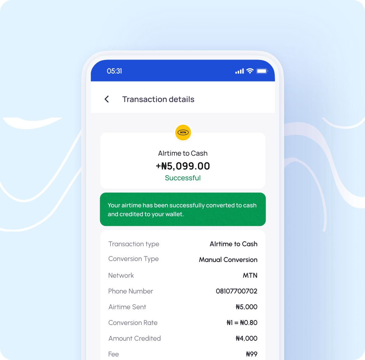 Simply provide the phone number containing the airtime and enter the OTP sent to that number. Once verified, your wallet will be credited instantly.